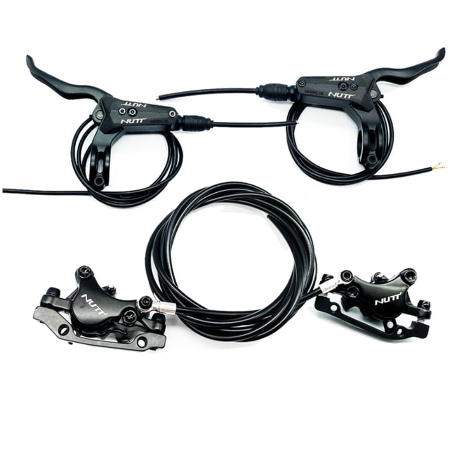 Kit complet de freins hydrauliques NUTT à 2 pistons comprenant les leviers gauche et droit, conçu pour offrir une puissance de freinage élevée et un contrôle précis sur les trottinettes électriques performantes. Ce système haut de gamme convient parfaitement aux remplacements ou upgrades sur des modèles puissants.