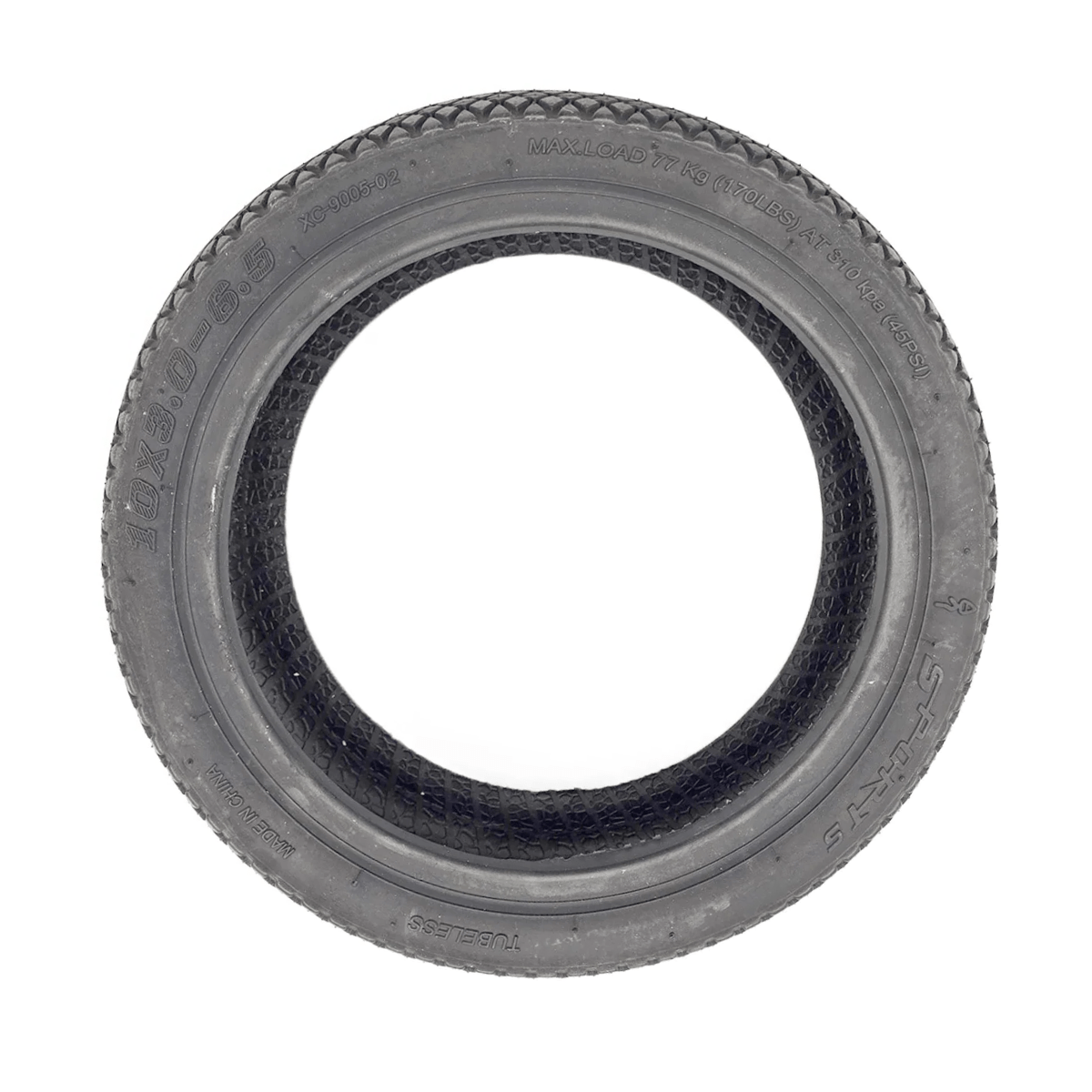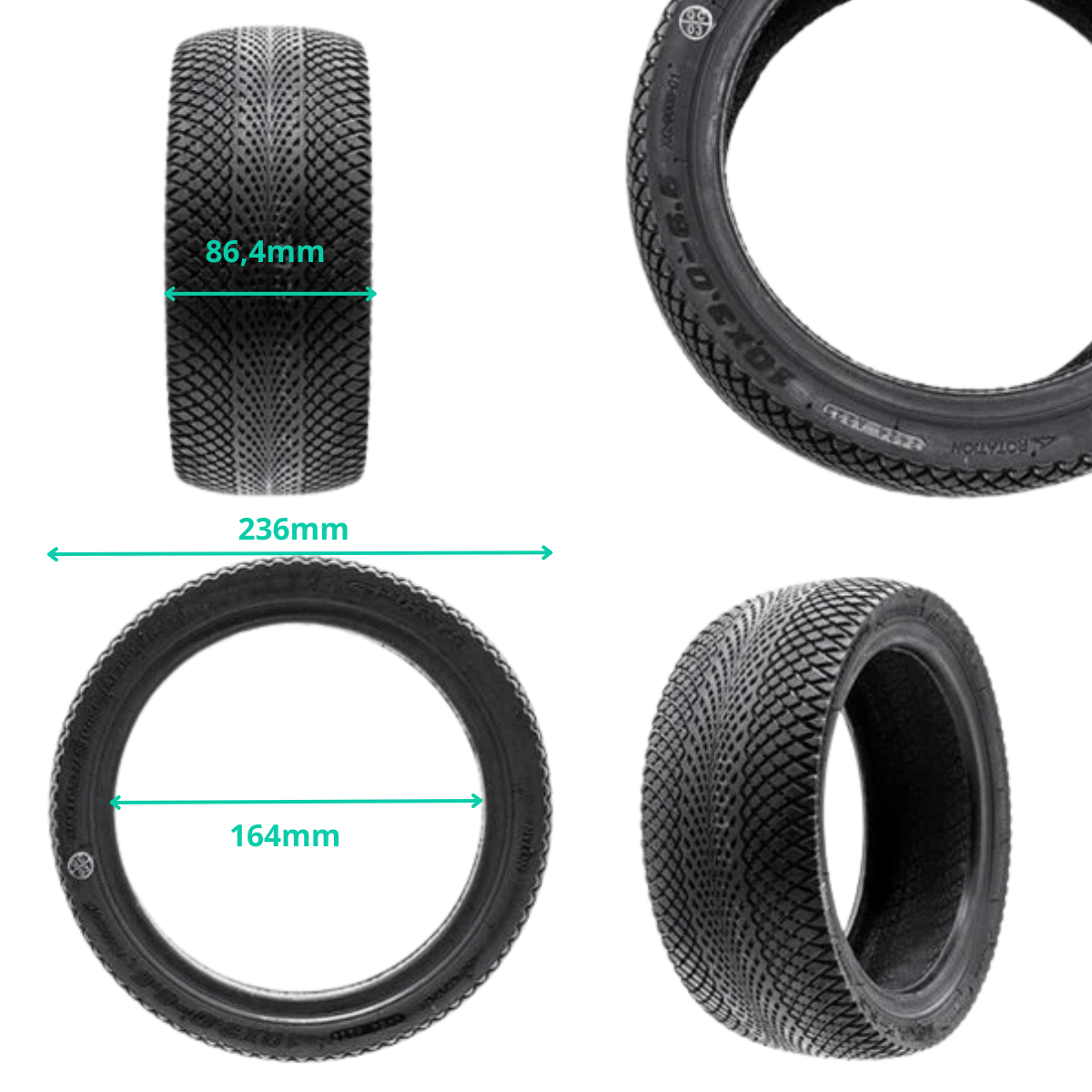 Pneu tubeless "Snake" 10x3-6,5. Son profil unique en forme d’écailles (“Snake”) garantit une excellente adhérence sur route tout en améliorant la stabilité et la dissipation de la chaleur.