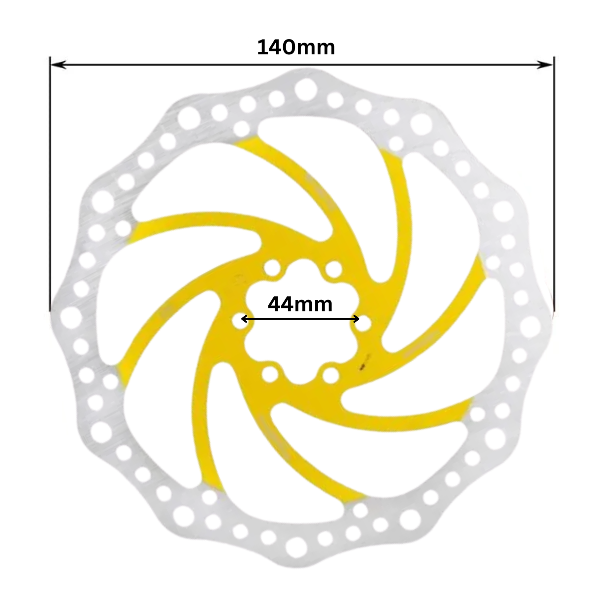 Disque de frein 140 mm à fixation 6 trous avec entraxe de 44 mm et finition jaune, compatible avec de nombreuses trottinettes électriques équipées de freins à disque. Ce diamètre supérieur offre un freinage plus puissant et une meilleure dissipation thermique, idéal pour les trottinettes plus rapides ou plus lourdes.