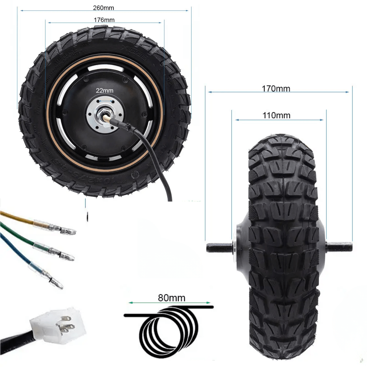 Le pneu 10x2,75-6,5 monté d’origine assure une adhérence optimale sur route et chemin, tandis que la jante renforcée garantit une excellente dissipation thermique et une longue durée de vie. L’ensemble est prêt à installer, avec un câblage standard pour une connexion directe au contrôleur.