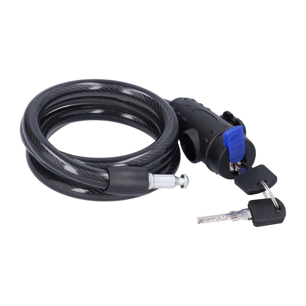 Antivol à câble avec clé, idéal pour sécuriser une trottinette électrique, un vélo ou tout autre petit véhicule. Son câble spiralé offre une grande flexibilité tout en permettant d’attacher facilement le cadre ou la roue à un point fixe.
